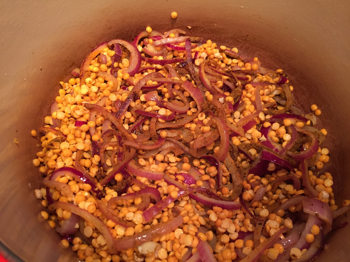 - When the lentils are tender, fish out the bay leaf and thyme sprigs and stir the onion mixture into the soup. Add cooked brown rice. Add more stock if the soup is too thick.